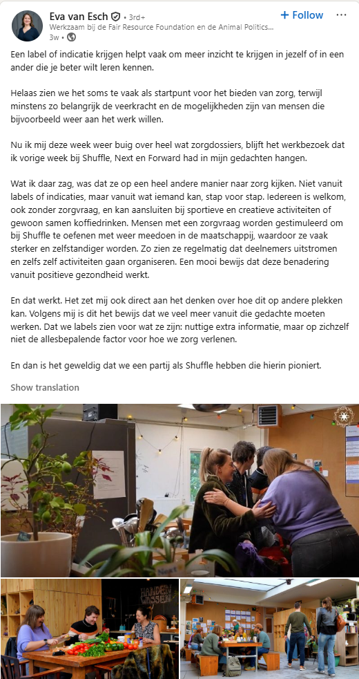 Bijdrage op LinkedIn van Eva van Esch (wethouder Natuur, Milieu en Zorg Gemeente Arnhem) van haar werkbezoek aan Shuffle